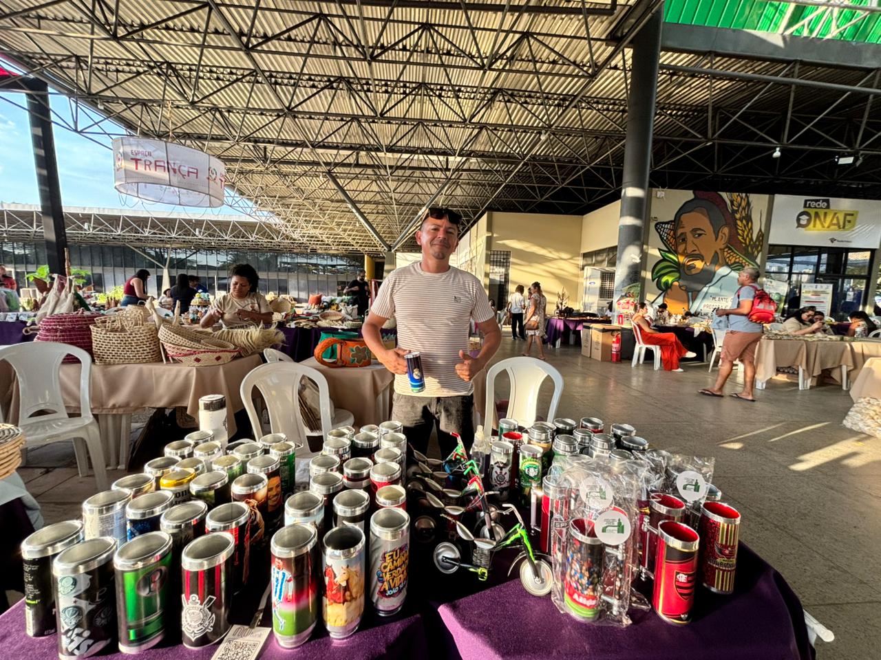 Levando ao pé da letra a ideia sustentável do evento, Elício de Sousa, de 43 anos, levou para a feira um trabalho transformador: canecas ecológicas e itens decorativos, feitos a partir de latas de refrigerante recicladas. “Eu sou cabeleireiro, mas sempre gostei de arte. Conheci a reciclagem e isso me despertou a curiosidade de aprender e produzir. Fui fazendo, as pessoas foram gostando, comprando e hoje é o que faço para complementar a renda e está dando certo”, disse o artista.