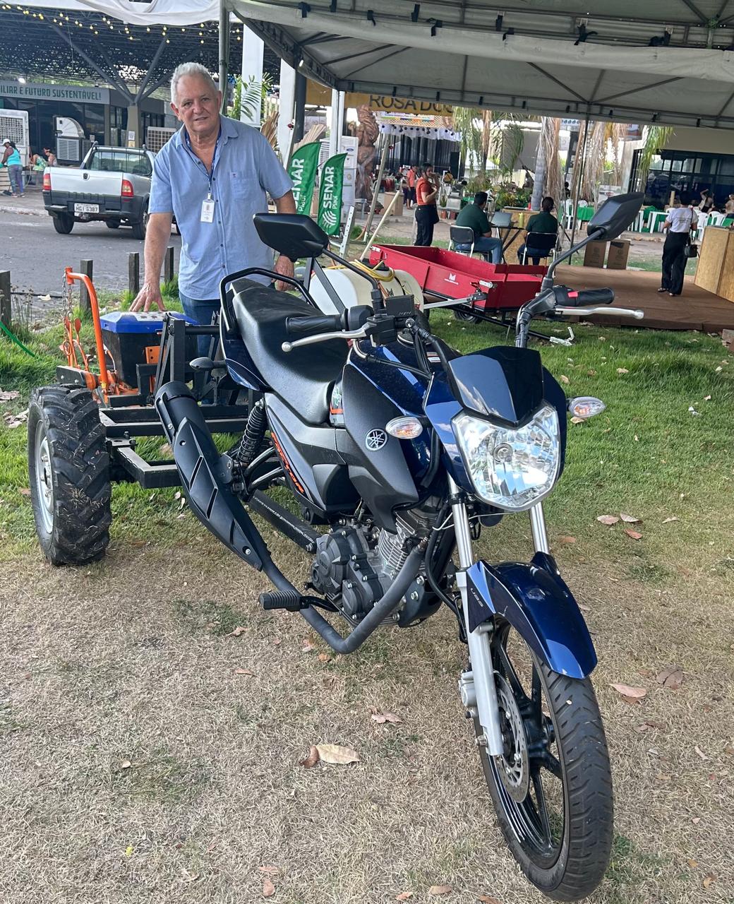 Outra atração do estande é uma solução criativa que tem chamado a atenção dos visitantes: a adaptação de motos em triciclos multifuncionais, pensada especialmente para o pequeno produtor rural. O pesquisador César Nogueira, da área de engenharia agrícola da Embrapa, explica que a ideia surgiu a partir de uma observação simples.