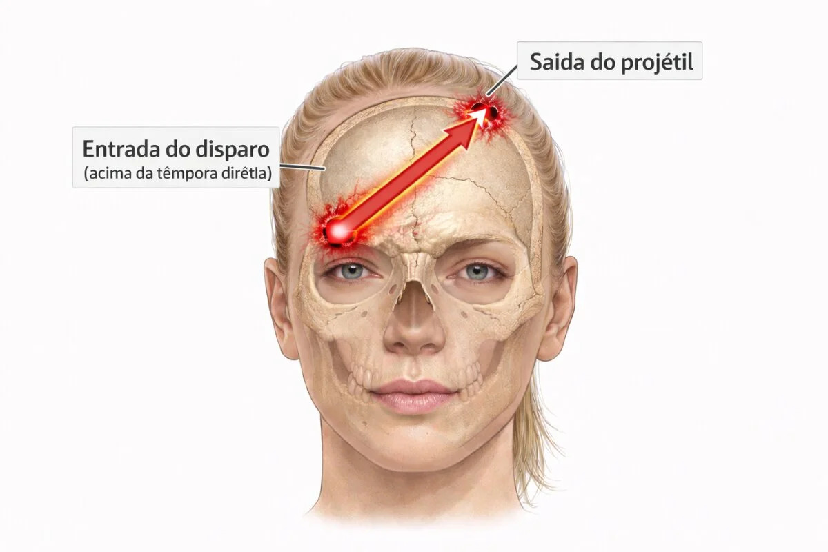 A análise pericial indica que o disparo entrou pelo lado direito da cabeça, próximo à têmpora, e atravessou o crânio (Reprodução)