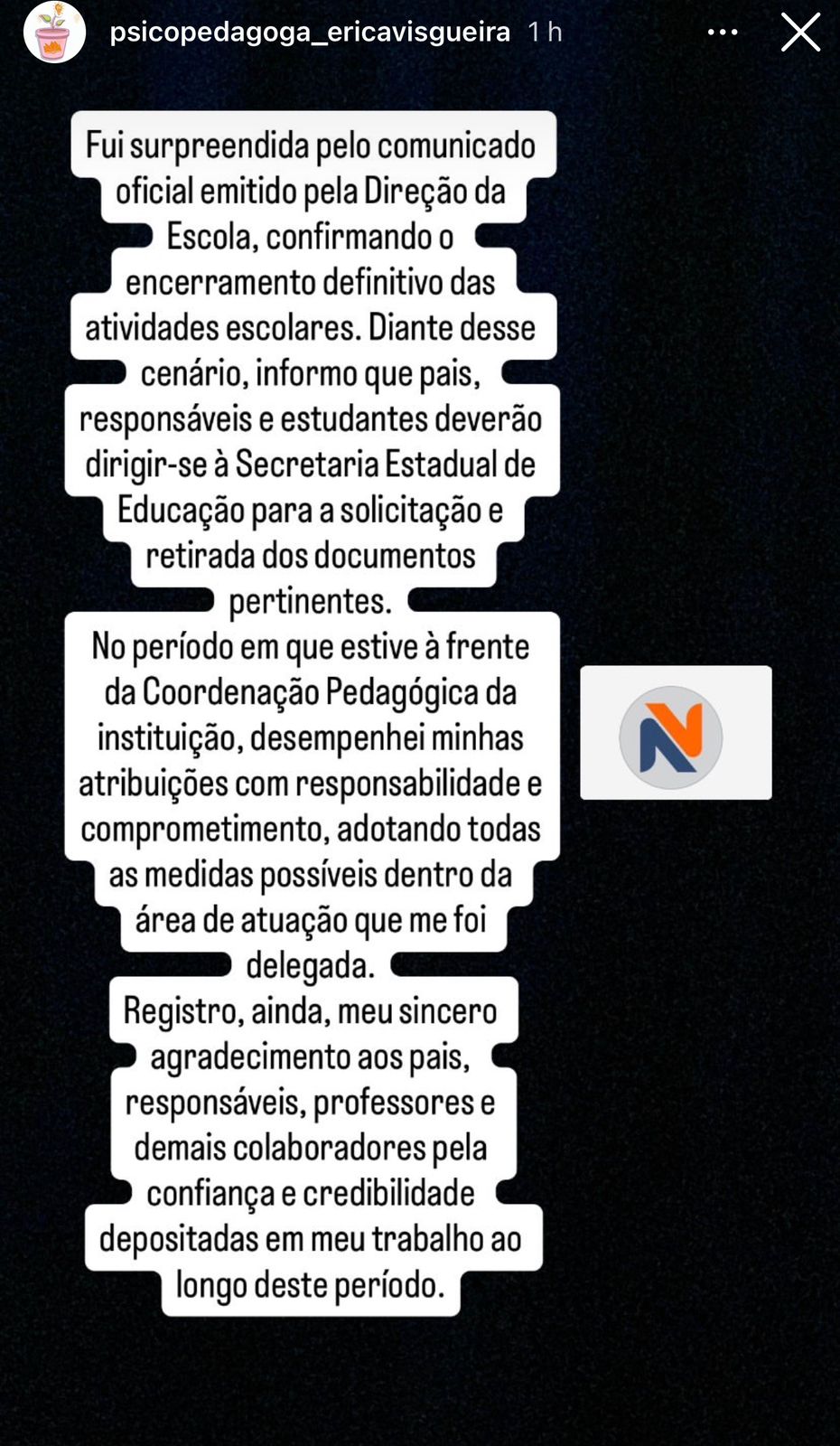A coordenadora do Colégio Inove, Erica Visgueira, também comunicou o fechamento da escola por meio de uma publicação no Instagram e disse que foi pega de surpresa.
