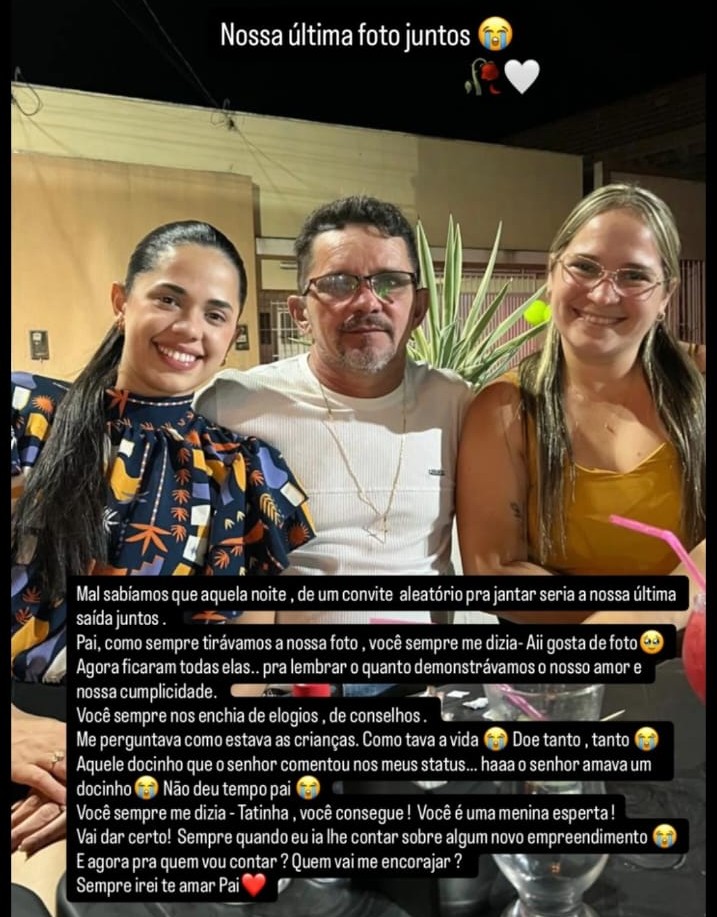 A filha de Rogério Pacífico lamentou a perda do pai, nas redes sociais. "Doe tanto, tanto. Mal sabíamos que aquela noite, de um convite aleatório pra jantar seria a nossa última saída juntos", disse Tatiane Pacífico.