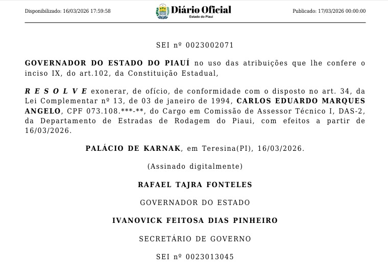A exoneração do assessor comissionado foi publicada no Diário Oficial do Estado do Piauí na segunda-feira (16).
