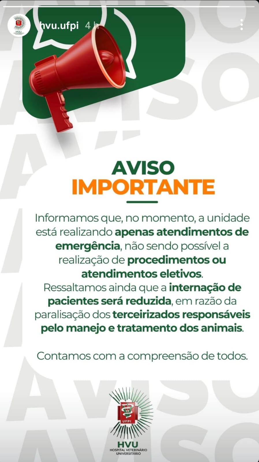 #Hospital Veterinário da UFPI; HVU; atendimentos de emergência; suspensão de atendimentos eletivos; paralisação de terceirizados