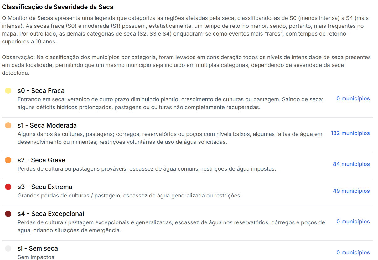 A Semarh explica que a seca extrema é marcada por grandes perdas agrícolas, comprometimento das pastagens e escassez generalizada de água. Entre os municípios nessa condição estão: São Raimundo Nonato, Paulistana, Betânia do Piauí, Simões, Acauã e Dom Inocêncio, no Sudeste do estado.