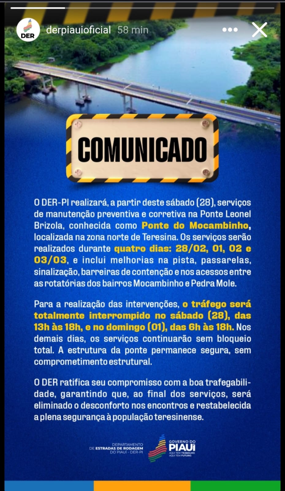 O tráfego de veículos na Ponte Leonel Brizola, conhecida como Ponte do Mocambinho, será totalmente interrompido neste sábado (28) e domingo (1º), na zona Norte de Teresina. A medida foi anunciada pelo Departamento de Estradas de Rodagem do Piauí (DER-PI) para a realização de serviços de manutenção preventiva e corretiva na estrutura.