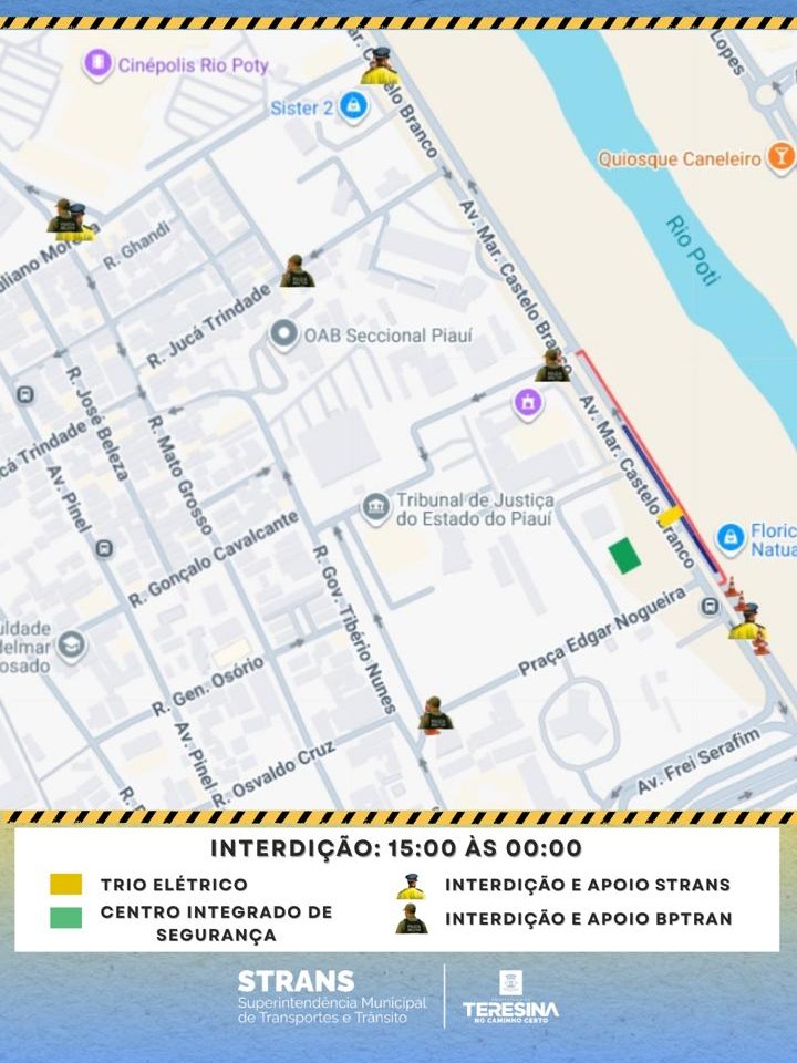 De acordo com o gerente de Operações da Secretaria da Segurança do Piauí, Igor Alves, o trabalho conjunto das forças de segurança será fundamental para o sucesso do evento. “A Secretaria da Segurança estará presente, garantindo a ordem pública do local. Polícia Militar, Polícia Civil e Corpo de Bombeiros Militar estarão mais uma vez atuando de forma integrada para garantir a segurança de todos”, destaca o gerente. a STRANS divulgou um mapa da área do show mostrando os trechos interditados.