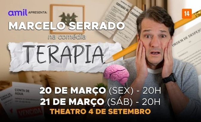 O destaque do fim de semana nos palcos fica por conta do ator Marcelo Serrado, que se apresenta pela primeira vez na capital com a comédia “Terapia”.
