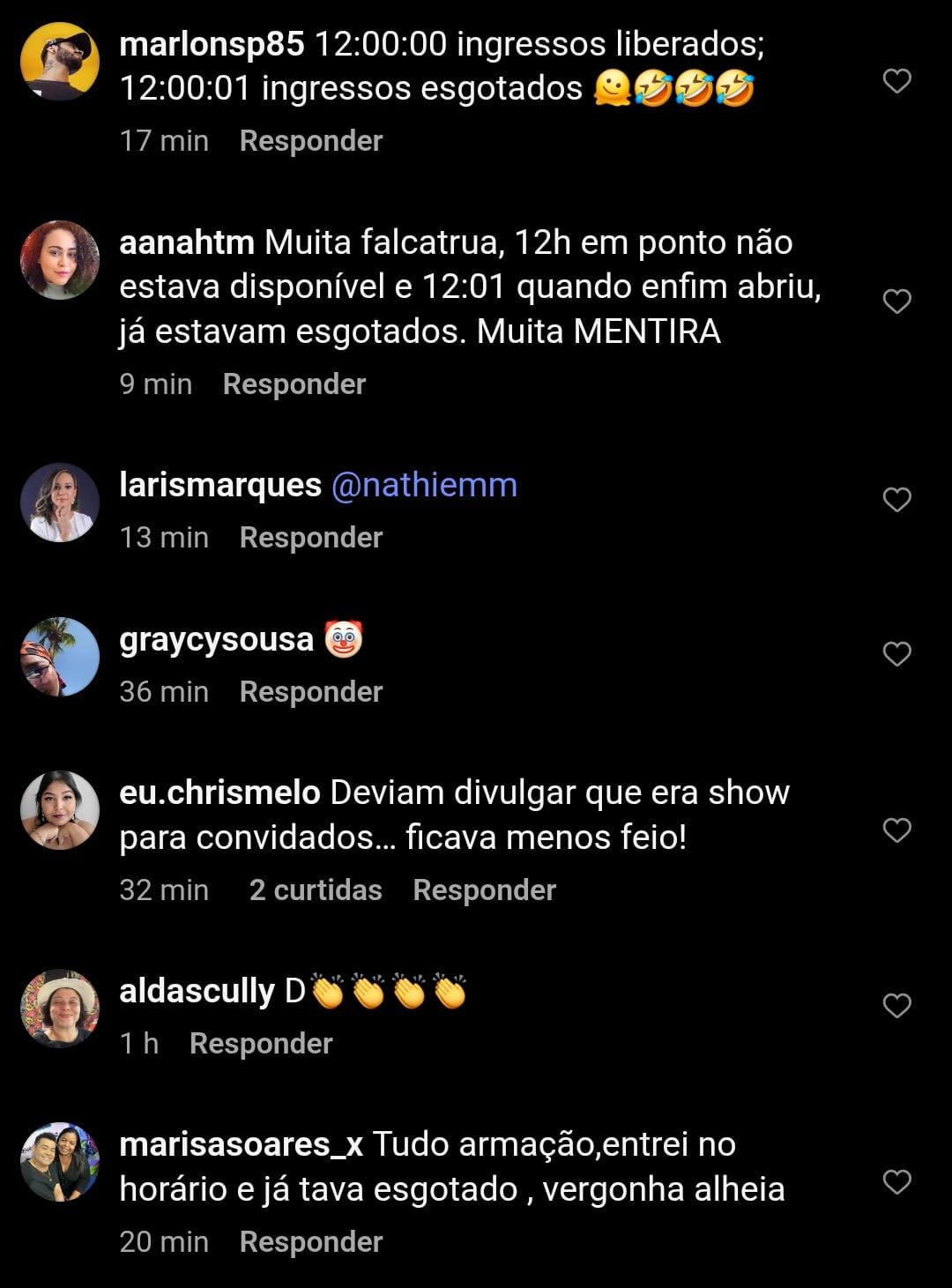 Outra internauta, @oliviarsousa, expressou sua revolta de maneira mais enfática. “Roubo na cara duraaa, impossível esgotar em 1 minuto.” Veja mais comentários na imagem abaixo: