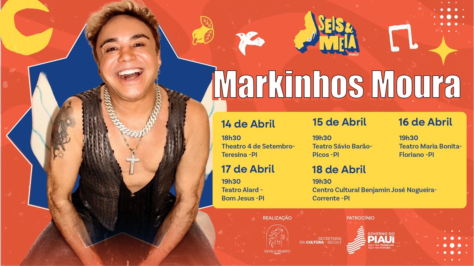 O projeto Seis&Meia Piauí realiza, entre os dias 14 e 18 de abril, uma série de shows com o cantor Markinhos Moura em cinco cidades do estado: Teresina, Picos, Floriano, Bom Jesus e Corrente.