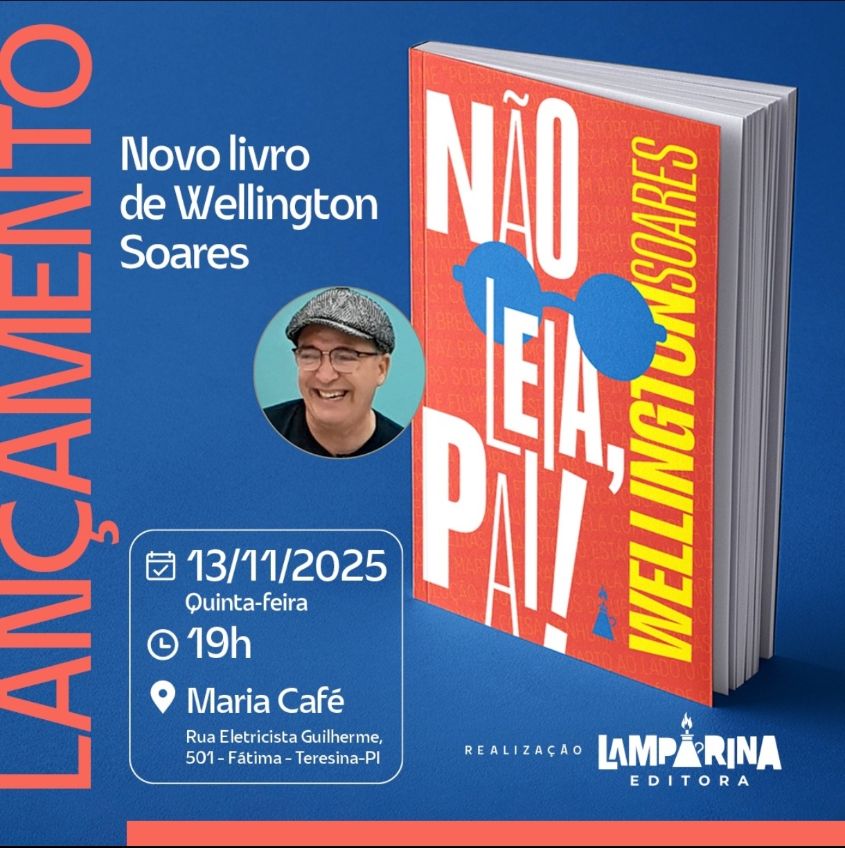 Com o livro Não Leia, pai!, o escritor Wellington Soares retoma a crônica, um dos gêneros de sua preferência literária. Ao todo, são 42 textos escritos entre os anos de 2017 e 2025, inspirados nas miudezas do cotidiano e nas memórias afetivas do autor. O lançamento ocorre nesta quinta-feira (13), às 19 horas, no espaço cultural Maria Café.