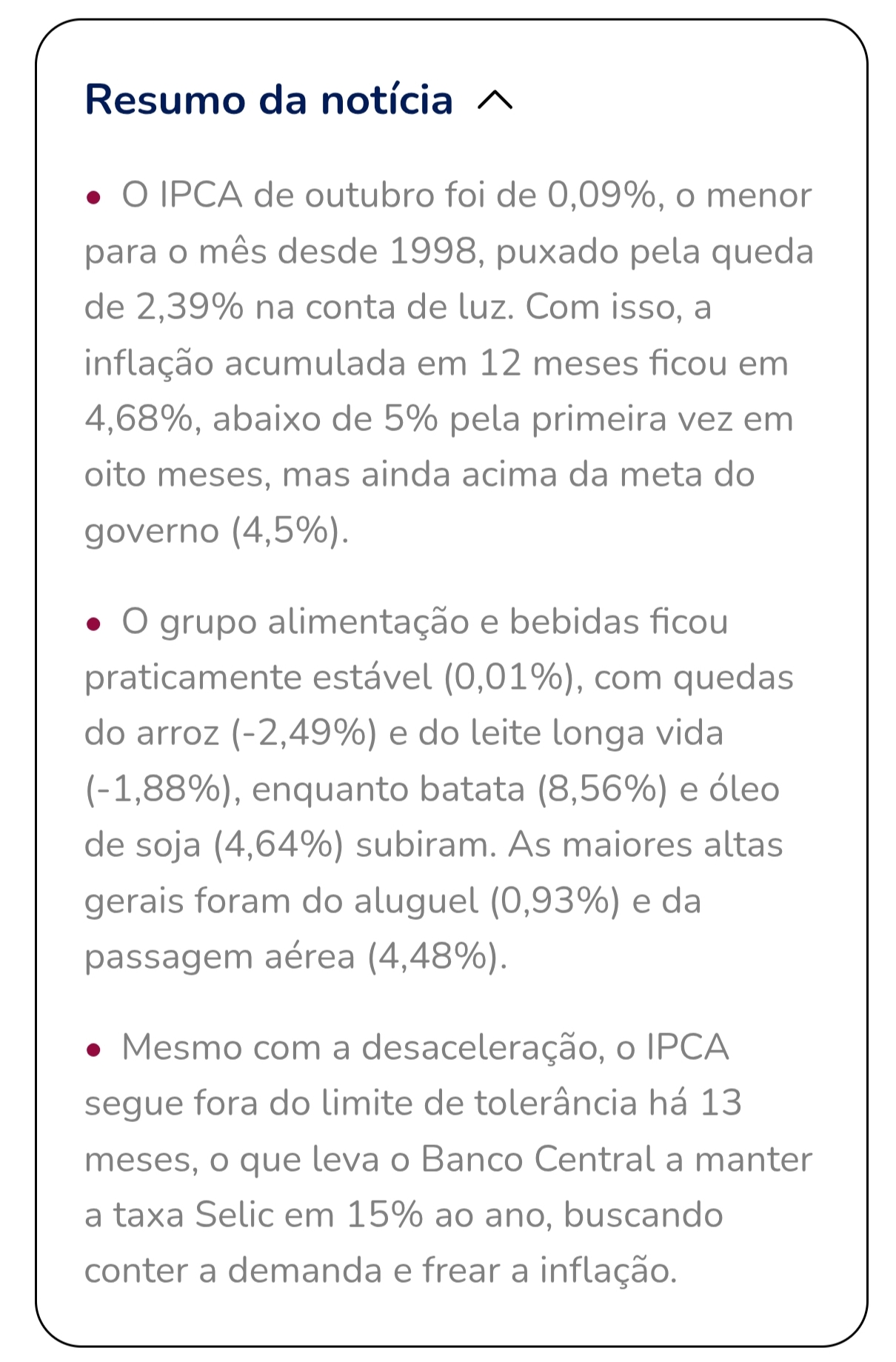 - Despesas pessoais: 0,45% (0,05 p.p.)