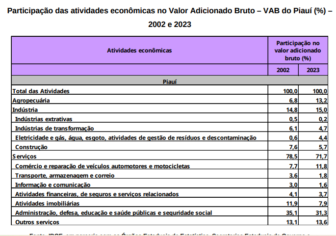 O VAB do Piauí atingiu R$ 73,02 bilhões em 2023, um aumento de 11,3% em relação ao ano anterior. O indicador, que mede a contribuição de cada setor produtivo para a economia, é a base do cálculo do PIB.