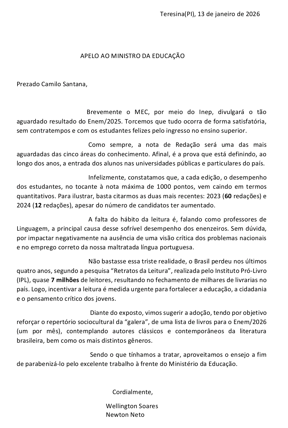 Em uma carta endereçada ao ministro da Educação, Camilo Santana, os professores Wellington Soares e Newton Neto fizeram um apelo público para que o Ministério da Educação (MEC) adote uma lista de livros de autores da literatura brasileira para o Exame Nacional do Ensino Médio (Enem) de 2026. O documento, datado de 13 de janeiro deste ano, alerta para a crise no desempenho dos estudantes na prova de redação e defende a leitura como solução urgente.