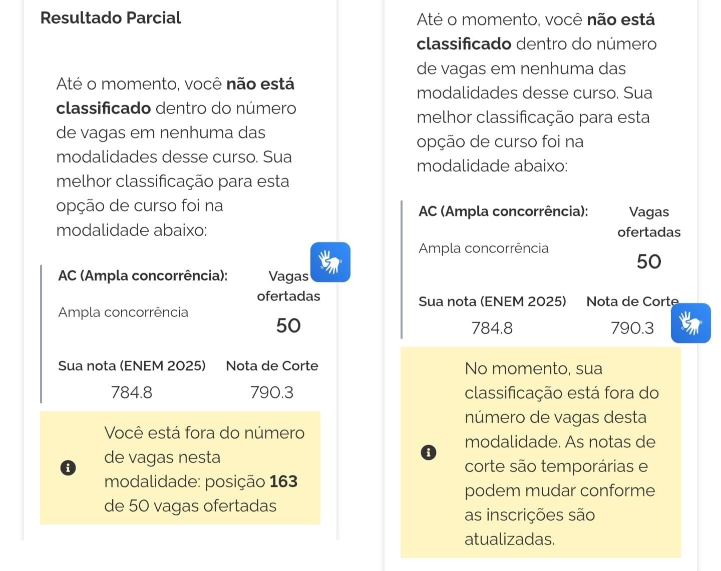 A falta de transparência tem gerado frustração e insegurança entre os estudantes, sentimento amplamente compartilhado em fóruns e redes sociais. A divulgação da classificação parcial orienta essas decisões, oferecendo ao candidato mais clareza sobre sua posição no processo seletivo e sobre o nível de concorrência em cada curso.
