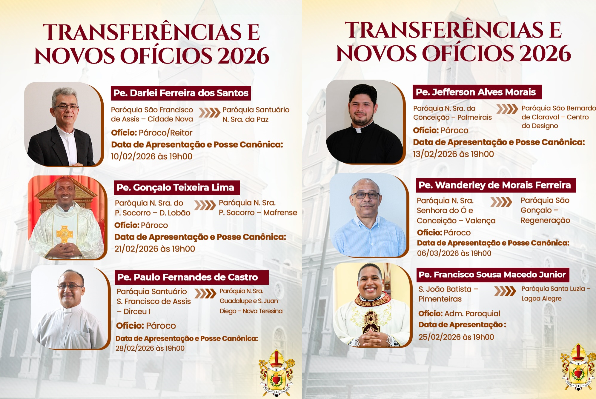 Também foram registradas transferências entre municípios. Um exemplo é a Paróquia Nossa Senhora dos Remédios, em União, que terá a saída do padre Waleff Conrado Pereira Lima, enviado para a Paróquia São Miguel Arcanjo, na cidade de Miguel Alves, com posse prevista para 6 de fevereiro.