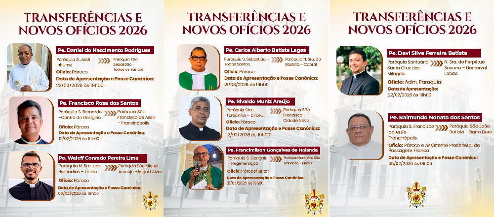 A Arquidiocese de Teresina divulgou a lista oficial das transferências e novas nomeações de padres que entrarão em vigor ao longo de 2026. As transferências envolvem paróquias da capital e do interior e fazem parte da reorganização pastoral da Igreja, que reforça o compromisso com a missão, a comunhão e o serviço às comunidades.