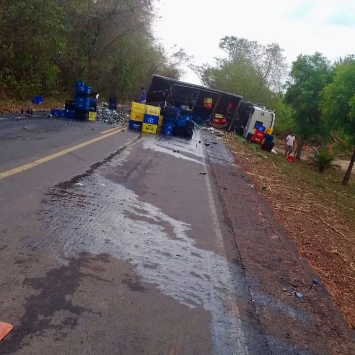 Equipe do Batalhão de Polícia Rodoviária Estadual (BPRE) foi acionado e colheu a informação de que o caminhão pertence a empresa Asa Branca Norte do Piauí. O condutor perdeu o controle do veículo, que tombou e a carga ficou espalhada pela rodovia.