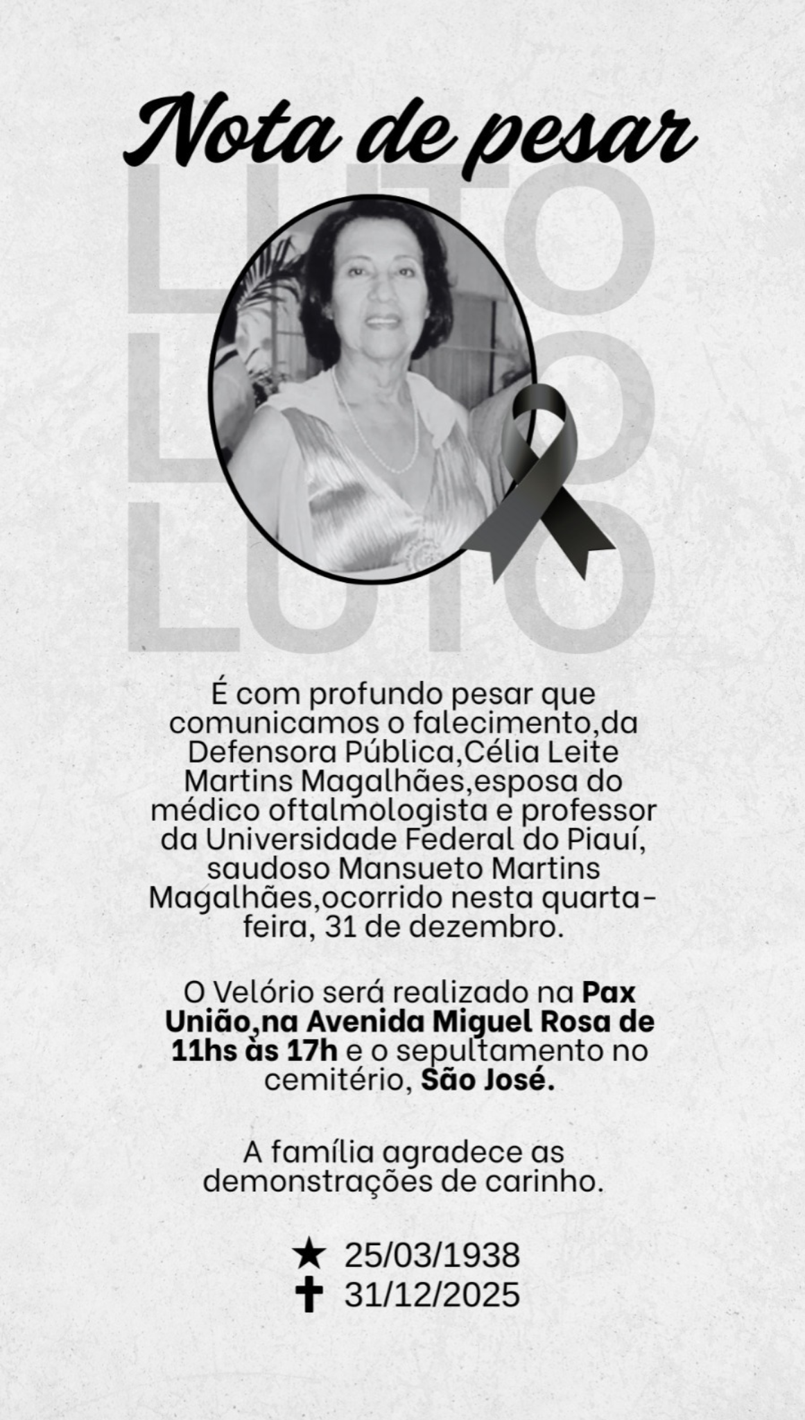Célia Leite teve uma trajetória marcada pela atuação na Defensoria Pública e era reconhecida pelo compromisso com a justiça e a defesa dos direitos da população. Ela era esposa do médico oftalmologista e professor da Universidade Federal do Piauí (UFPI), Mansueto Martins Magalhães, que faleceu vítima da Covid-19 em 2020.