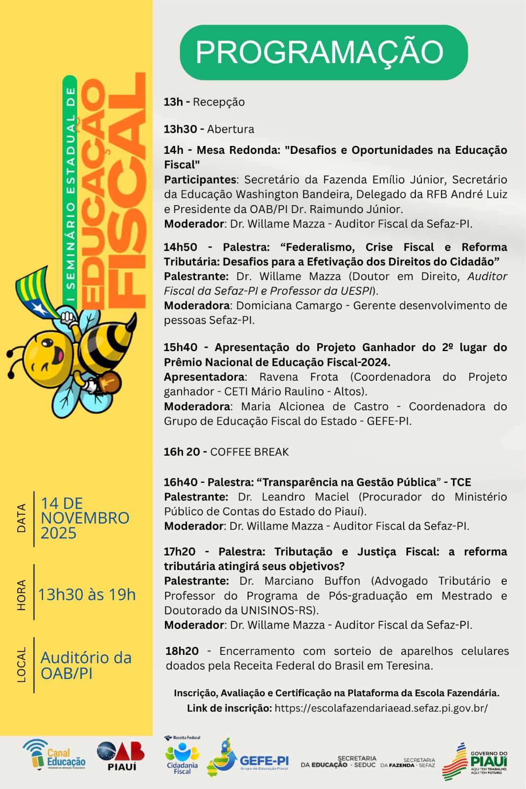 Ter conhecimento sobre para onde vão os impostos e como funciona o sistema tributário é um passo fundamental para o exercício da cidadania. Para debater esse tema, o Grupo Estadual de Educação Fiscal do Piauí (GEFE-PI) realizará o I Seminário Estadual de Educação Fiscal 2025. O evento acontece no próximo dia 14 de novembro, das 13h30 às 19h, no auditório da Ordem dos Advogados do Brasil, seccional Piauí (OAB-PI), em Teresina.