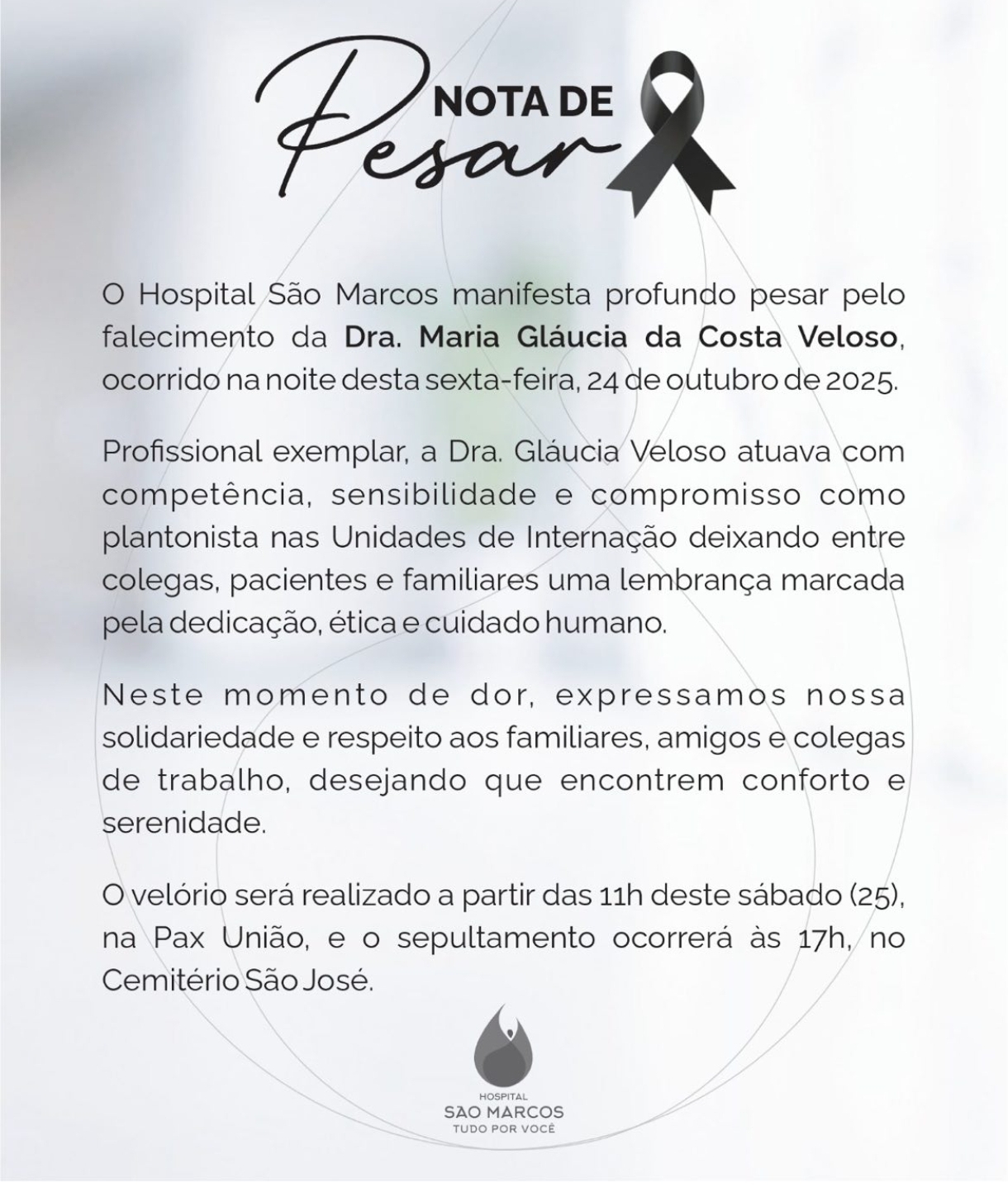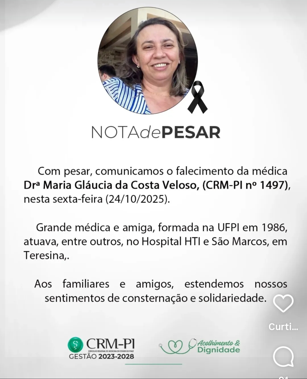 O Conselho Regional de Medicina do Piauí - CRM/PI, e o Hospital São Marcos lançaram nota de pesar pela morte da médica. O sepultamento de Gláucia Veloso está marcado para às 17 horas, no Cemitério São José.