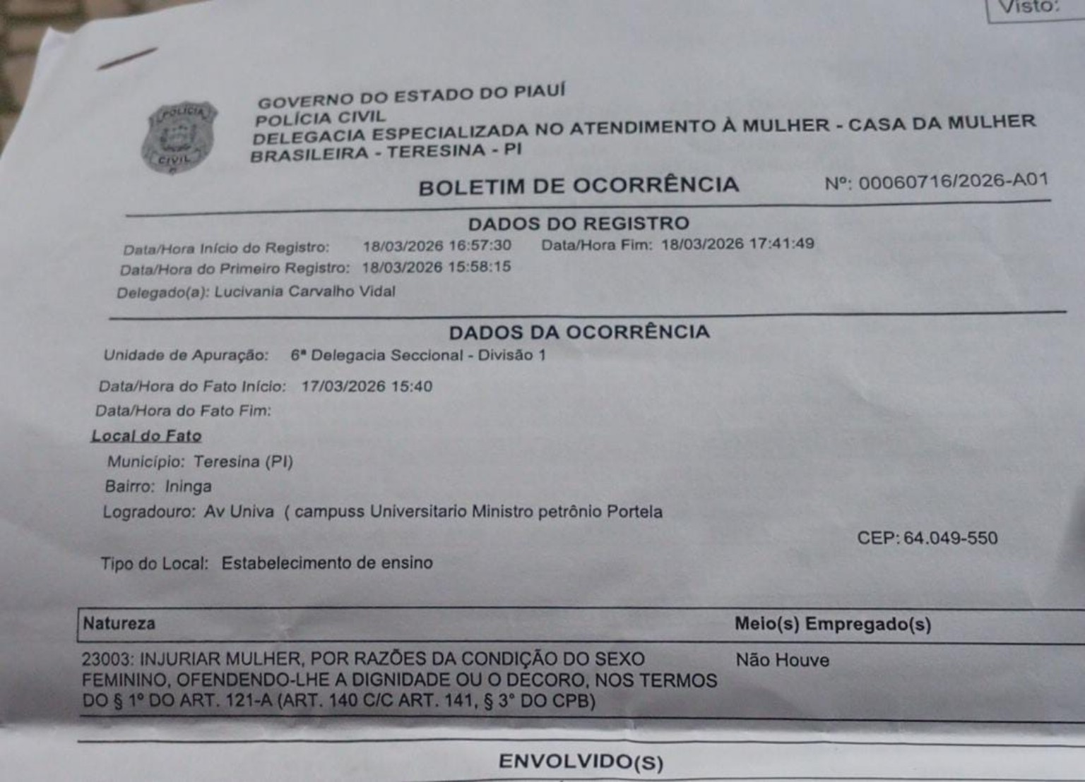 O caso foi registrado pela delegada Lucivania Carvalho Vidal e será apurado pela 6 Delegacia Seccional - Divisão 1. A natureza do b.o foi classificada no âmbito do § 1º do Art. 121-A (art. 140 c/c art. 141, § 3º do Código Penal Brasileiro, que trata do crime de injuriar mulher por razões da condição do sexo feminino, ofendendo-lhe a dignidade ou o decoro.