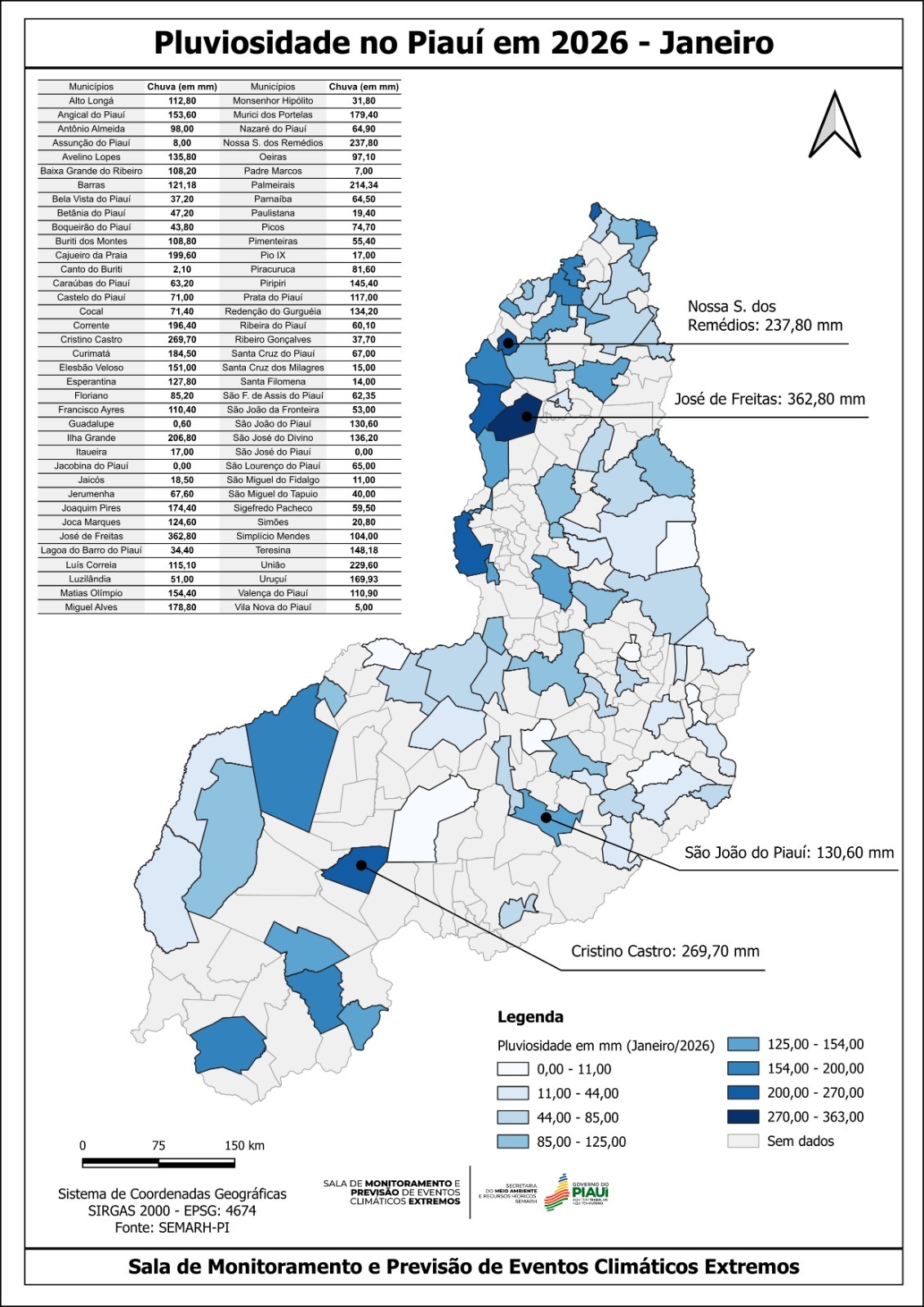 Durante o mês de janeiro, o município que mais registrou chuva foi José de Freitas, com o acumulado de 362,80mm, seguido por Cristino Castro, com 269,70mm. Em Nossa Senhora dos Remédios, o acumulado ficou em 237,80mm e, em São João do Piauí chegou a 130,60mm.