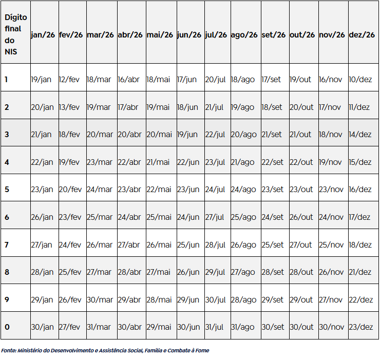 Os pagamentos ocorrerão nos últimos dez dias úteis de cada mês, de forma escalonada conforme o dígito final do Número de Inscrição Social (NIS), exceto em dezembro, quando o cronograma é antecipado em cerca de uma semana por causa do Natal. Os depósitos começarão em 19 de janeiro, para as famílias com NIS de final 1, e terminarão em 23 de dezembro, para as famílias com NIS de final 0.
