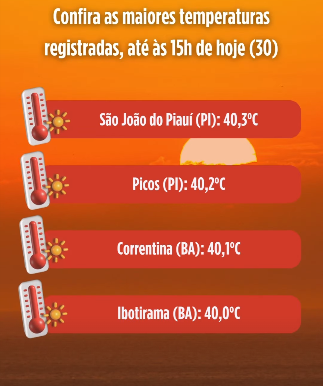 Dados do Instituto Nacional de Meteorologia (Inmet), apontam que duas cidades do Piauí registraram as maiores temperaturas do país nessa quinta-feira (30). São João do Piauí liderou o ranking nacional, com 40,3°C, seguida de Picos, que marcou 40,2°C até as 15h.