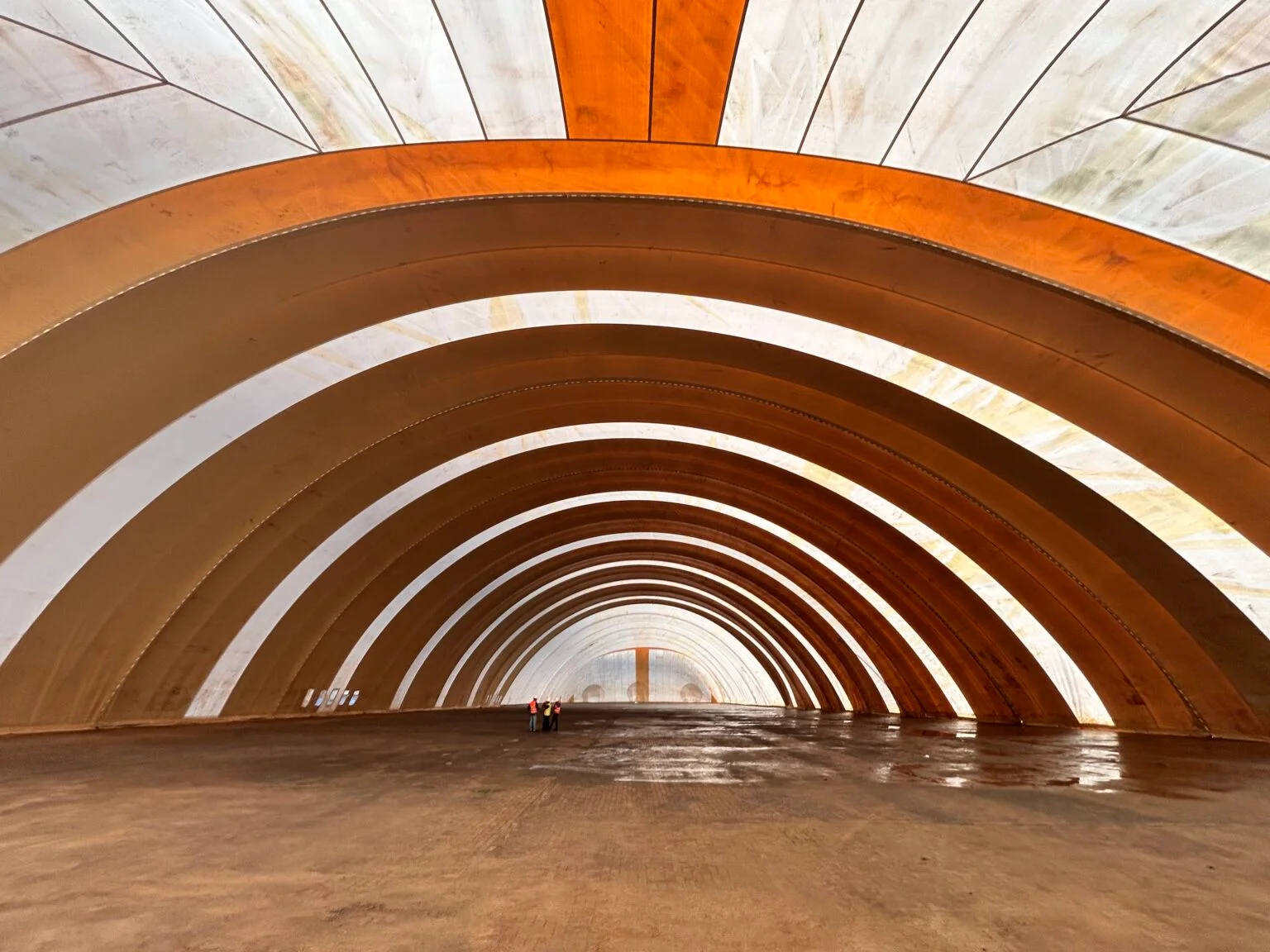 Diferente de modelos convencionais, o galpão é inflável. A estrutura é fixada ao solo por estacas e mantida por um sistema de aerogeradores especiais. Este modelo foi escolhido pelo custo reduzido e instalação rápida, além da possibilidade de desmobilização com a mesma agilidade.
