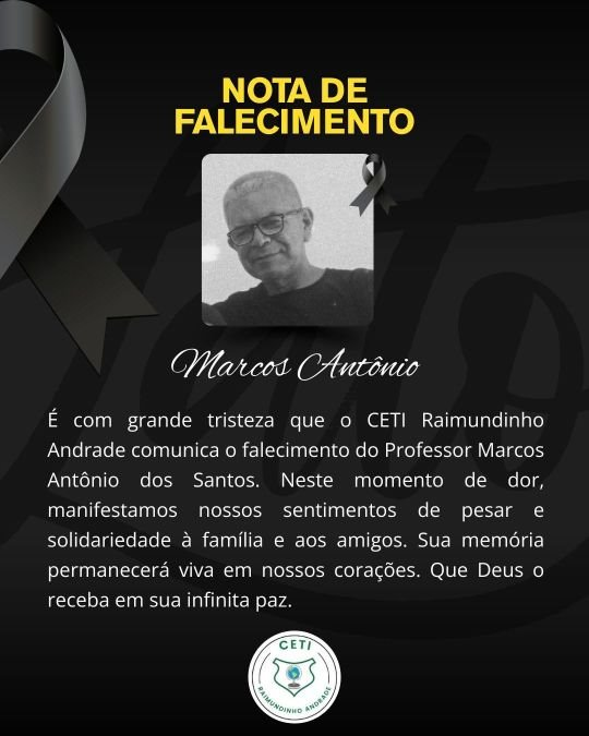 “É com grande tristeza que o CETI Raimundinho Andrade comunica o falecimento do professor Marcos Antônio dos Santos. Neste momento de dor, manifestamos nossos sentimentos de pesar e solidariedade à família e aos amigos. Sua memória permanecerá viva em nossos corações. Que Deus o receba em sua infinita paz.”