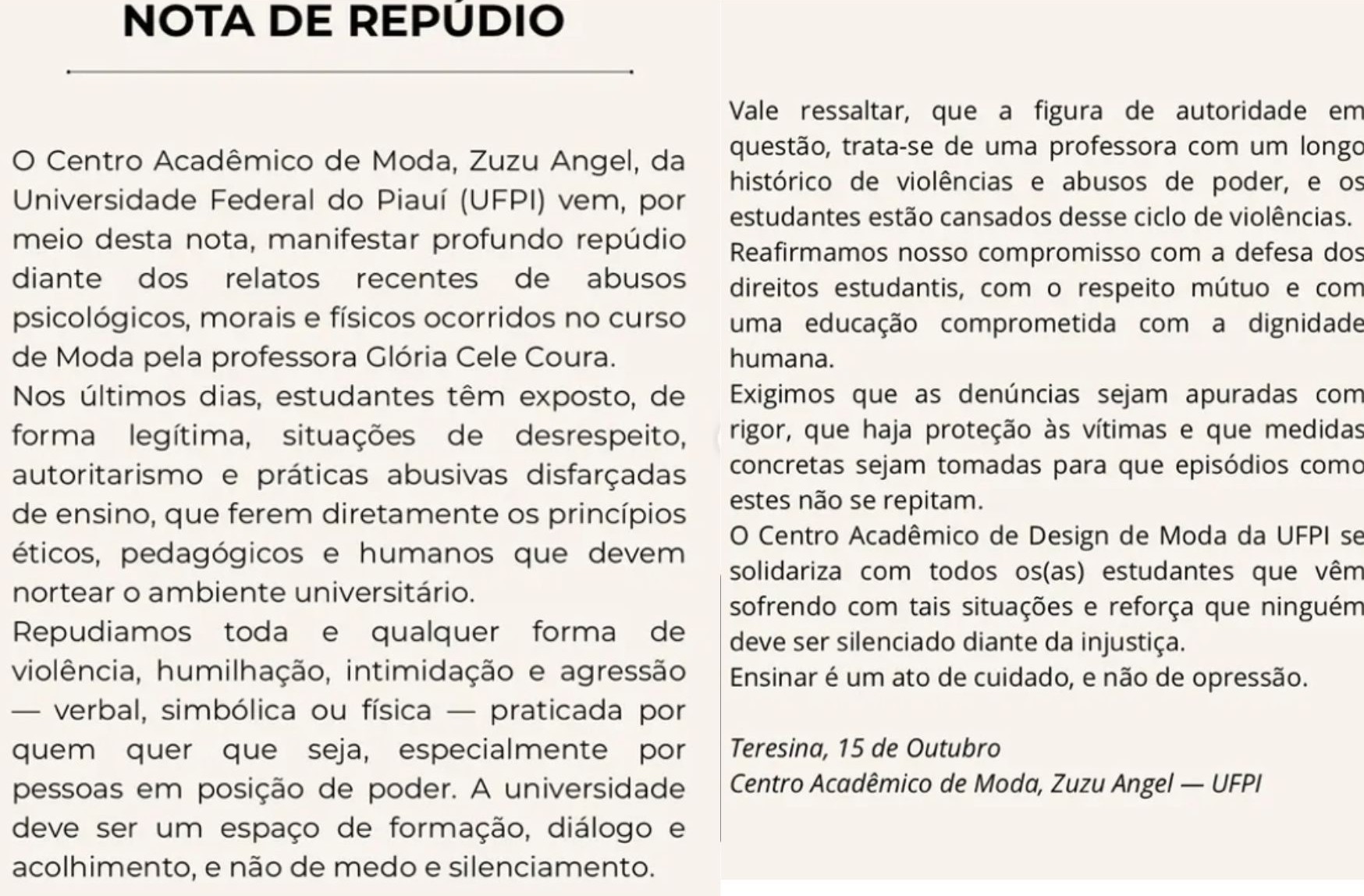 Em publicação nas redes sociais, o Centro Acadêmico de Moda da Ufpi, Zuzu Angel, repudiou a violência contra as estudantes.