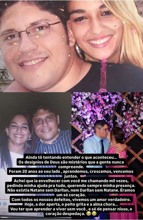 " Achei que ia envelhecer com você me chamando mil vezes, pedindo a minha ajuda pra tudo, querendo sempre minha presença. Não existe Natane sem Darllan. Hoje, a dor aperta, o peito grita e a alma chora", postou Natane.