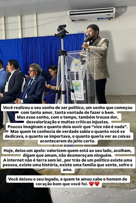 "Você realizou o seu sonho de ser político, um sonho que começou com tanto amor, tanta vontade de fazer o bem. Mas esse sonho, com o tempo, também trouxe dor, desvalorização e muitas críticas injustas... a internet não é terra sem lei! Por trás de um político existe uma pessoa, uma história e uma família que sente, sofre e ama. Você deixou seu legado, e quem te amou sabe o homem de bom coração que você foi", concluiu.