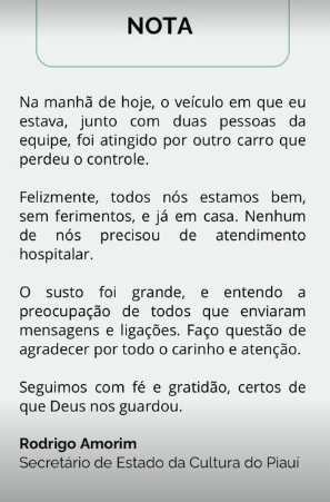 Rodrigo Amorim, secretário de Cultura do estado do Piauí, divulgou uma nota esclarecendo o acidente que sofreu na manhã deste sábado (8) na BR-343, em Campo Maior. Ele disse que estava em um carro com duas pessoas de sua equipe quando foi atingido por outro veículo cujo motorista perdeu o controle.