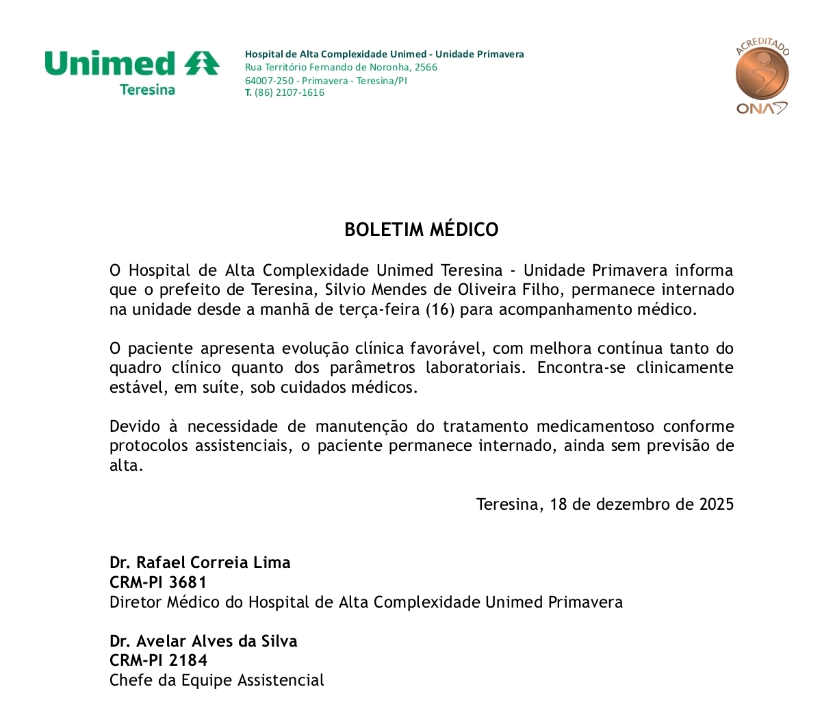 O prefeito de Teresina, médicos Silvio Mendes, de 76 anos, continua internado no Hospital Unimed Primavera, na Zona Norte de Teresina, para tratamento de uma "virose braba". Um novo boletim médico divulgado no início da tarde desta quinta-feira (18/12), informa que ele melhorou, mas como precisa manter o tratamento e os medicamentos em hospital, não tem previsão de alta.