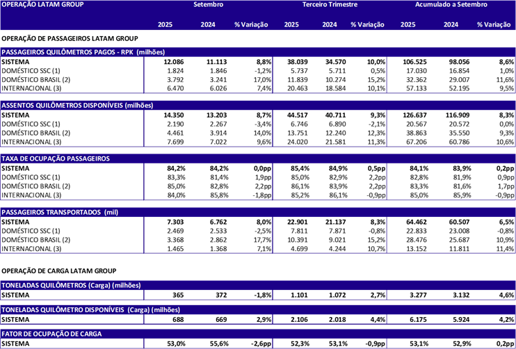De acordo com o balanço da companhia, o grupo LATAM transportou 7,3 milhões de passageiros em setembro, um aumento de 8% em relação ao mesmo mês do ano anterior. Entre janeiro e setembro de 2025, já foram mais de 64,5 milhões de passageiros transportados.