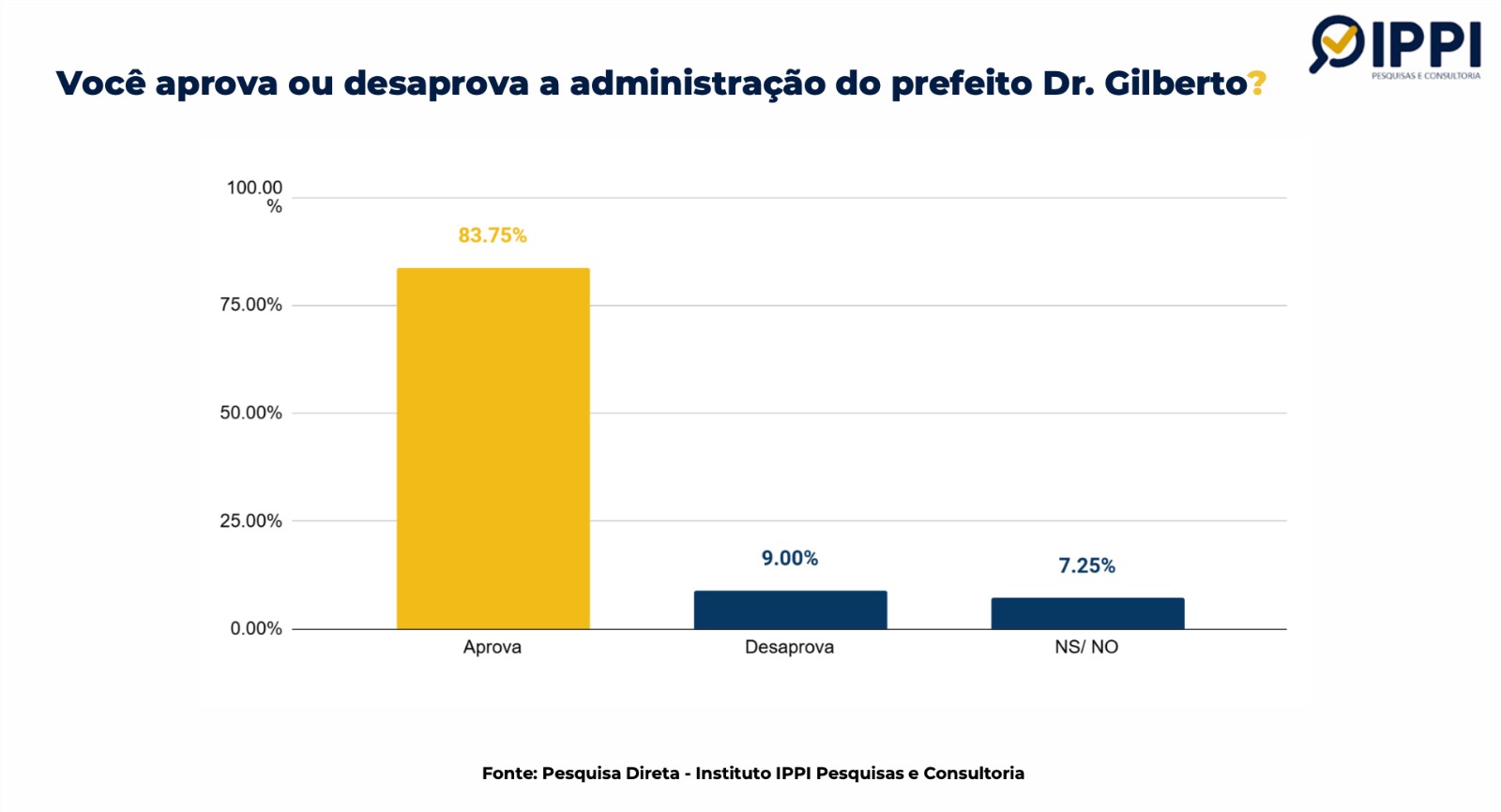 A gestão do prefeito Dr. Gilberto Júnior em Uruçuí, Sul do Piauí, alcançou um alto índice de aprovação popular, segundo uma pesquisa recente do Instituto de Pesquisa IPPI. O levantamento, realizado entre os dias 22 e 24 de outubro de 2025 nas zonas urbana e rural do município, revelou que 83,75% da população aprova o trabalho do prefeito que está a frente da gestão municipal há 10 meses.