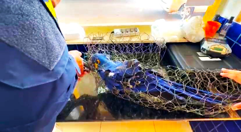 Arara-azul resgatada pela PRF morre após ser encontrada presa em arames no Piauí