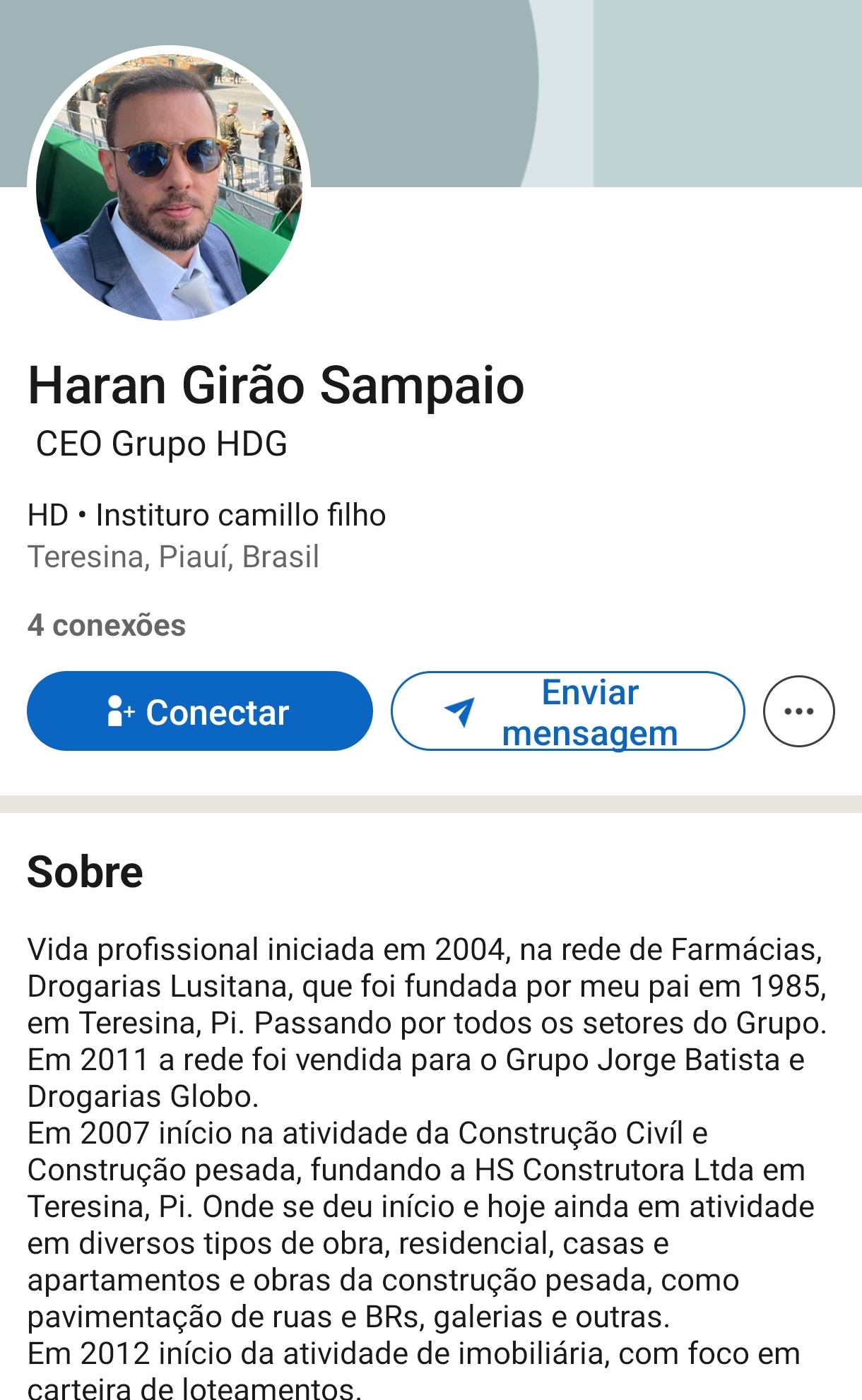 Em seu perfil no LinkedIn, Haran Santhiago Girão Sampaio traça sua própria biografia empresarial e o sucesso dos negócios iniciados quando tinha 20 anos: