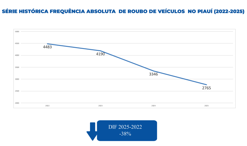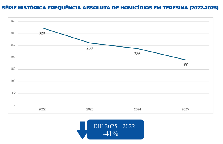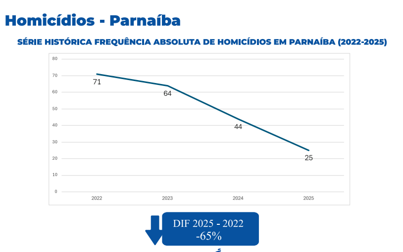 Os homicídios também seguiram a curva de redução. Em 2025, foram registrados 526 casos, contra 756 em 2022, o que corresponde a uma diminuição de 30%. Em Teresina, a capital, o recuo foi ainda mais acentuado, chegando a 41,5%. Já em Parnaíba, no litoral do Estado, a redução alcançou 65% em comparação com os números de 2022.