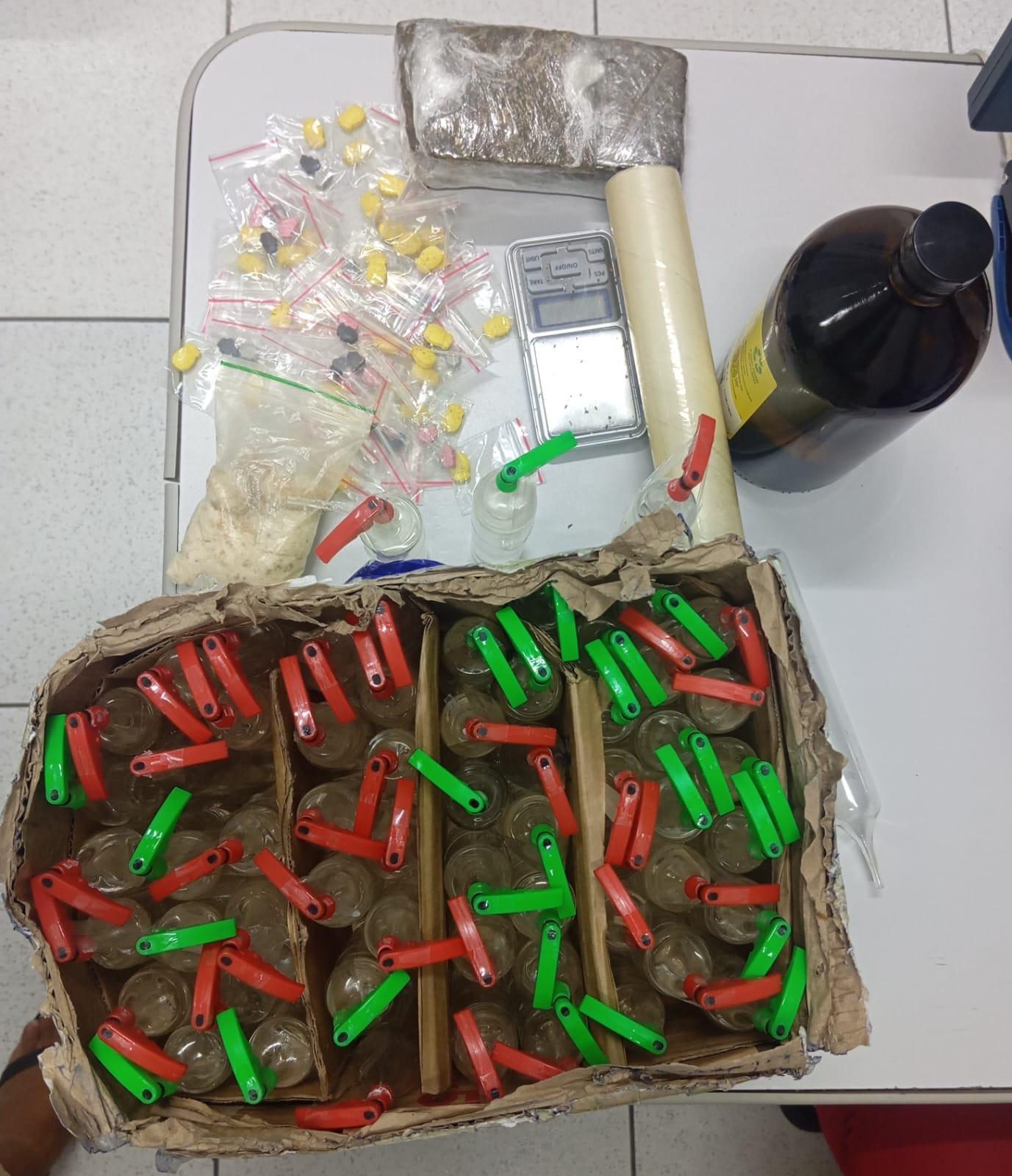 Com autorização da proprietária do imóvel, os policiais realizaram buscas na casa e encontraram o material no quarto do filho da moradora. Além dos comprimidos de ecstasy e dos frascos de lança-perfume, foram apreendidos dois pedaços prensados de maconha, um pacote pequeno de substância análoga a crack, uma balança de precisão, dois rolos de papel filme e um recipiente de grande porte contendo lança-perfume.