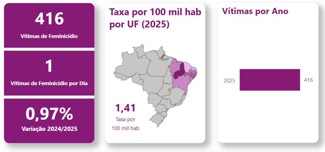 Os dados representam uma tragédia contínua que evidencia um problema estrutural de violência de gênero no Brasil. A taxa nacional ficou em 0,69 feminicídio por 100 mil habitantes, mesma assinalada nos últimos anos, mas com o maior contingente de vítimas já registrado desde que a Lei do Feminicídio foi sancionada, em 2015.