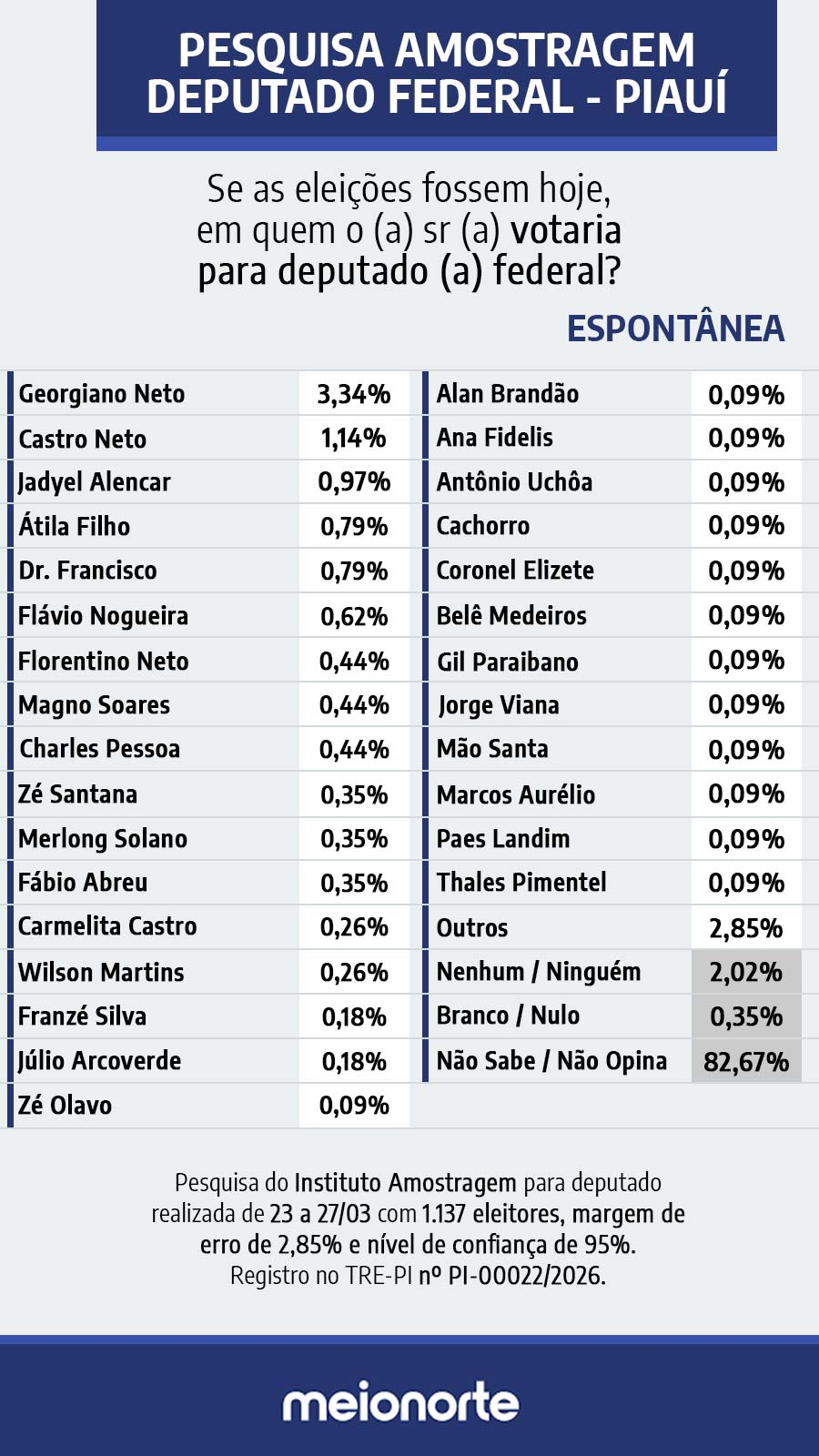 A mais recente pesquisa do Instituto Amostragem revelou os primeiros nomes destaques na corrida para deputado federal no Piauí, apontando um cenário ainda bastante indefinido, mas com alguns nomes saindo na frente na pesquisa espontânea do eleitor. De acordo com o levantamento, o deputado Georgiano Neto lidera as citações com 3,34%, seguido por Castro Neto, que aparece com 1,14%. Na sequência, Jadyel Alencar soma 0,97%, enquanto Átila Filho e Dr. Francisco aparecem empatados com 0,79%.