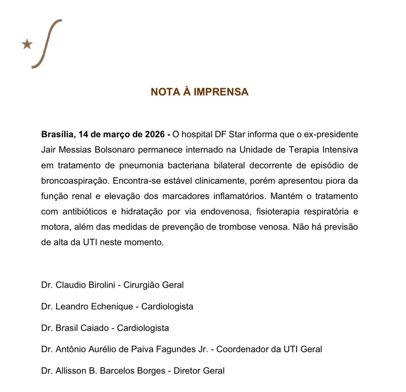 De acordo com o comunicado, Bolsonaro está clinicamente estável, mas exames recentes indicaram agravamento da função dos rins e aumento de marcadores inflamatórios no organismo, o que exige acompanhamento intensivo da equipe médica.