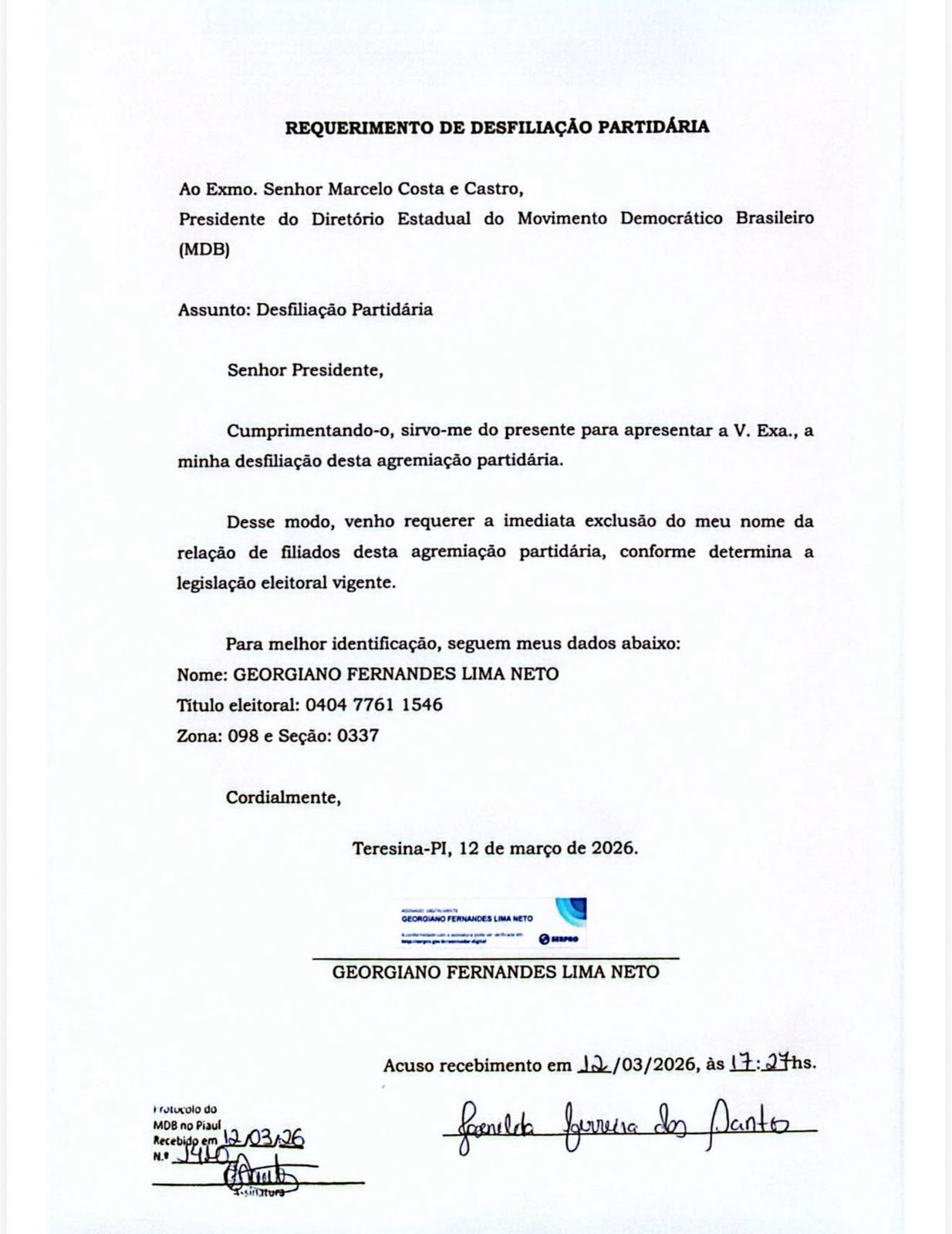 O deputado estadual Georgiano Neto anunciou pelas redes sociais, a saída do Movimento Democrático Brasileiro (MDB), partido pelo qual foi eleito em 2022. Na publicação, o parlamentar afirmou que já solicitou a desfiliação e que deve anunciar em breve uma nova filiação partidária com foco nas eleições de 2026.
