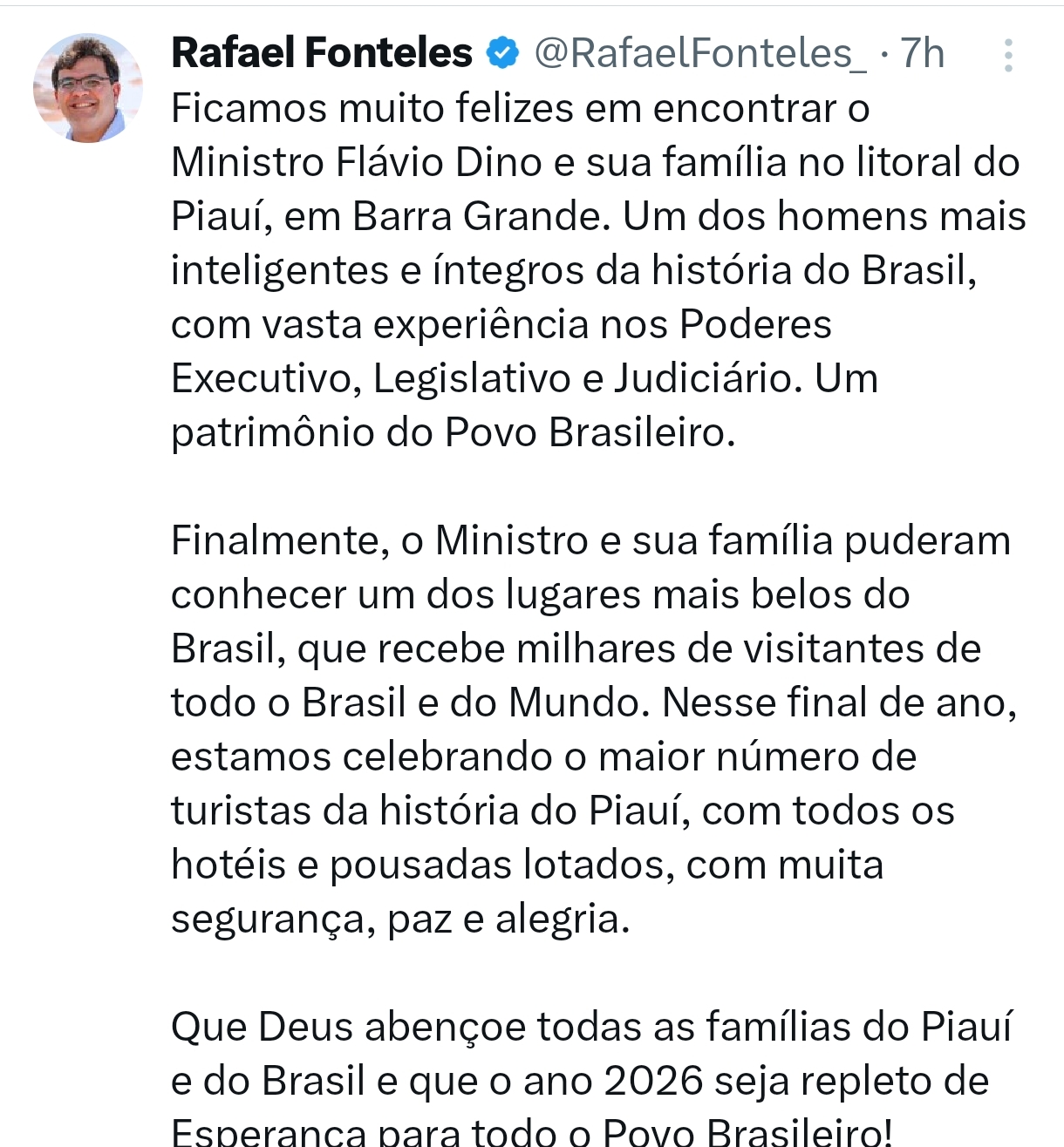 "Ficamos muito felizes em encontrar o Ministro Flávio Dino e sua família no litoral do Piauí, em Barra Grande. Um dos homens mais inteligentes e íntegros da história do Brasil, com vasta experiência nos Poderes Executivo, Legislativo e Judiciário. Um patrimônio do Povo Brasileiro", escreveu Fonteles.