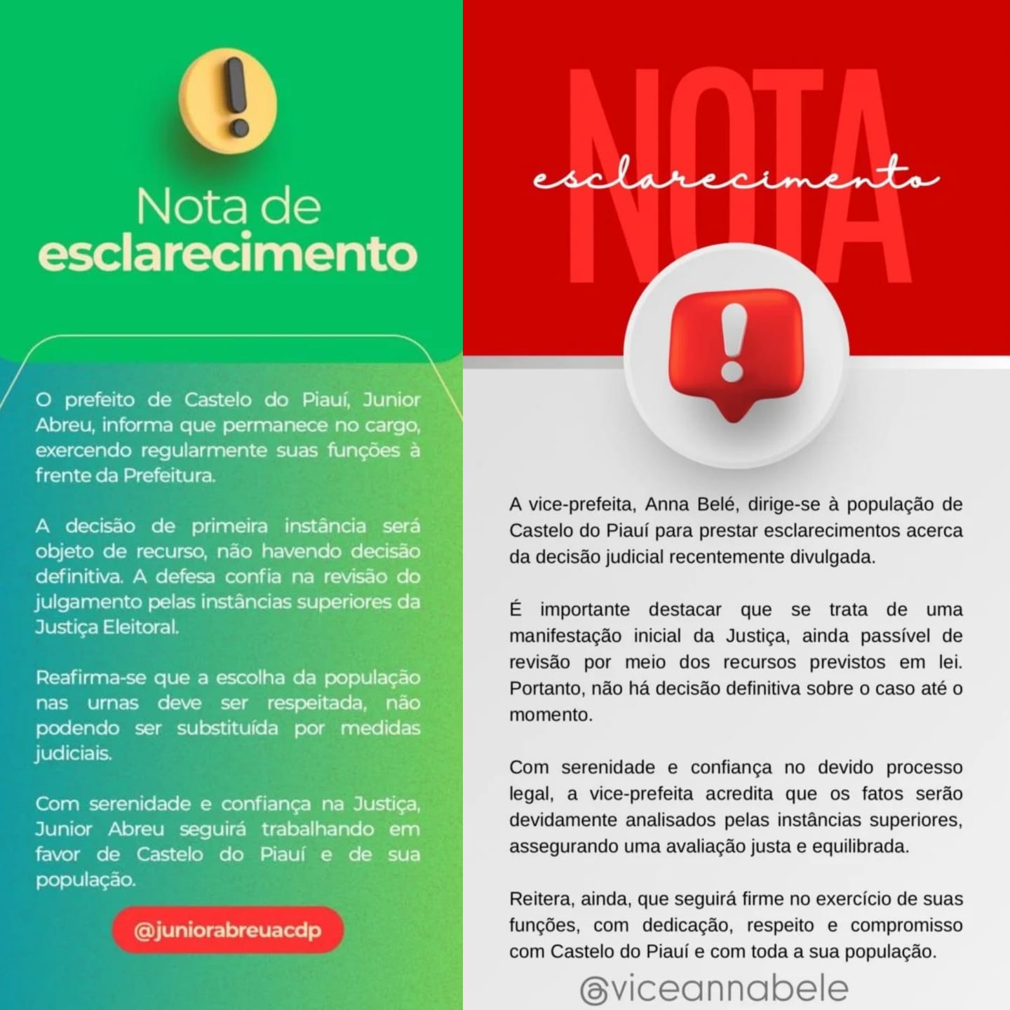 O prefeito de Castelo do Piauí, Júnior Abreu (PT) e a vice-prefeita Anna Belé foram cassados pela Justiça Eleitoral nesta terça-feira (14). A decisão assinada pelo juiz Raniere Santos Sucupira, também declarou a inelegibilidade dos gestores e do ex-prefeito José Magno Soares da Silva por oito anos. A sentença aponta práticas de abuso de poder político e econômico, além de compra de votos durante as eleições de 2024.