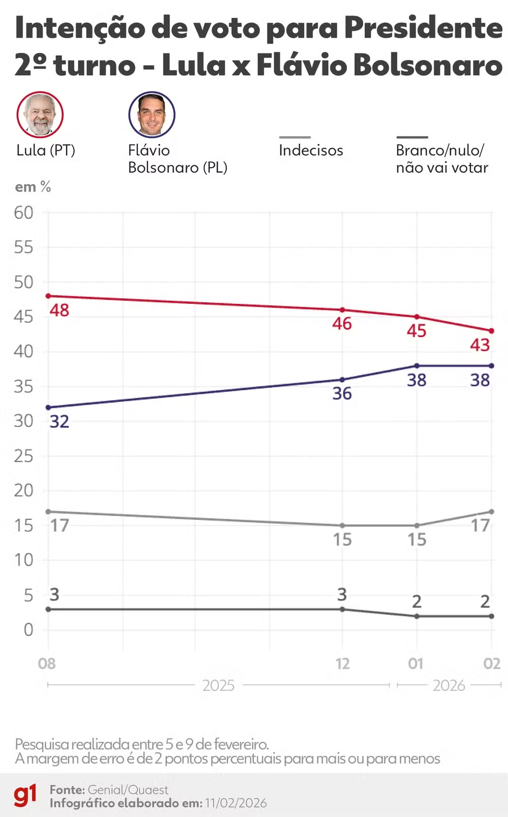 Entre os eleitores que se consideram independentes, grupo que pode decidir a disputa, a vantagem de Lula sobre Flávio era de 16 pontos e agora é de cinco. Em janeiro, o presidente tinha 37% nesse grupo, e o senador, 21%. Na pesquisa atual, Lula aparece com 31%, contra 26% de Flávio.