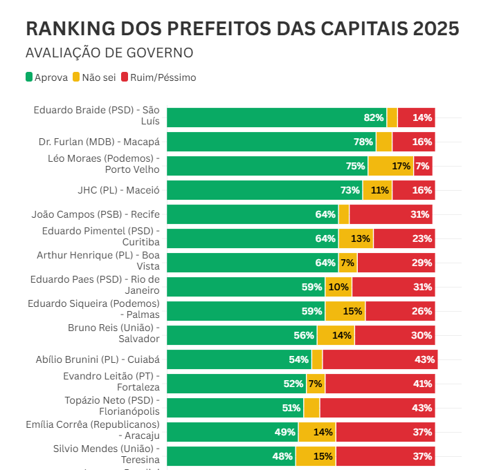 O ranking nacional é liderado por Eduardo Braide (PSD), de São Luís, com 82% de aprovação. Em segundo, aparece Dr. Furlan (MDB), de Macapá, com 78%, seguido por Léo Moraes (Podemos), de Porto Velho, com 75%.