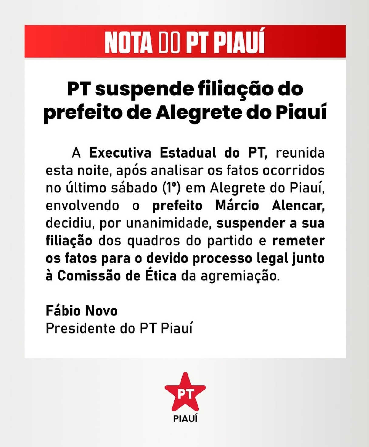 Em nota oficial, o PT do Piauí afirmou que "repudia veementemente toda e qualquer forma de violência, perseguição e desrespeito aos direitos humanos e à integridade física e moral das pessoas". A suspensão da filiação é a medida partidária imediata diante da gravidade dos fatos, que estão sendo investigados pela Polícia Civil.